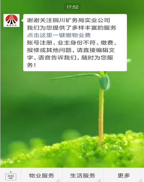 該微信號負責人介紹說,現(xiàn)在,有手機打開銅局實業(yè)微信號,首頁為轄區(qū)居民提供了物業(yè)服務、生活服務、咨詢指引功能。進入物業(yè)服務界面,業(yè)主可以隨時查詢自己家的物業(yè)費情況;通知、公告等信息可第一時間獲??;公共設施損壞,拍個照片,上傳到服務平臺,馬上就會有專人前去維修……銅局實業(yè)后勤服務正在逐步實現(xiàn)“智慧物業(yè)管理”,由對“物的管理”轉變?yōu)閷Α叭说姆铡保鼙姺詹皇軙r間、空間、距離限制,“互聯(lián)網(wǎng)+物業(yè)”在改變傳統(tǒng)物業(yè)服務模式的同時,為全局職工群眾帶來了更多的便利。