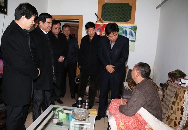 劉水利一行到礦后,聽取了金華山礦行政負(fù)責(zé)人劉星河就春節(jié)期間安全生產(chǎn)等工作安排情況的簡要匯報(bào),對(duì)抓好節(jié)日期間安全生產(chǎn)工作提出了具體要求。隨后,劉水利一行首先來到在西山平房居住的困難職工、機(jī)電車間職工王剛家里。王剛父母長年患病,家中生活十分困難。劉水利握住王剛的手說:“我代表公司領(lǐng)導(dǎo)看望你們了?!彼聛硗鮿偧凹胰死鹆思页?,詢問王剛工作、生活等方面的情況,并叮囑王剛好好工作,孝順父母,做一個(gè)優(yōu)秀的企業(yè)員工。