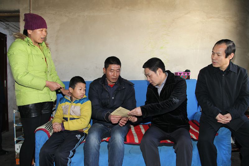 王海帆一行到礦后,顧不上休息,來到困難職工--陜西省勞動模范、金華山礦綜掘隊隊長魏定龍家,在了解了魏定龍同志的工作、家庭、生活等方面情況后,王海帆握住魏定龍的手,親切的說;“我受陜煤化集團公司董事長、總經(jīng)理的委托,代表集團公司黨政來看望你了。感謝你這么多年奮戰(zhàn)在生產(chǎn)第一線,為礦區(qū)安全生產(chǎn)等方面所做的貢獻。今后,你在工作和生活中有什么困難告訴我們和你們礦、公司的領導,我們幫你解決。在今后的工作中,希望你發(fā)揮勞模帶頭作用,團結和帶領全隊干部職工,為構建安全穩(wěn)定和諧新礦區(qū)再做新貢獻。同時,祝你全家新年快樂?!?/p>