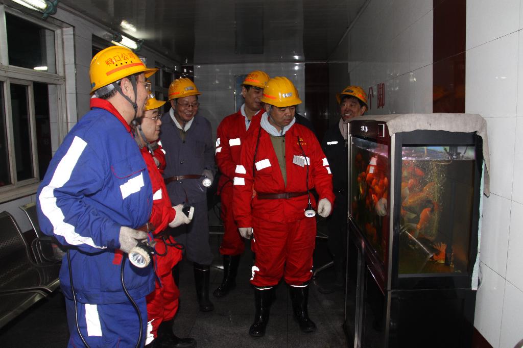 在井下運(yùn)輸調(diào)度室,檢查組認(rèn)真查看了井下運(yùn)輸調(diào)度控制系統(tǒng),并觀看了操作演示。在三角點(diǎn),當(dāng)看到員工休息室的一缸金魚(yú)時(shí),檢查組成員紛紛感慨道:這既能休息,還能賞魚(yú),礦工井下的作業(yè)環(huán)境變化真大啊。