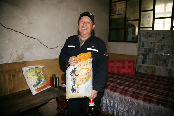 抱著米面油的米世國(guó)激動(dòng)地說(shuō):謝謝!