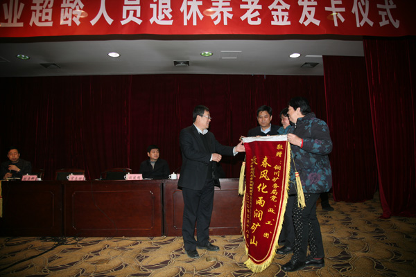 未參保超齡人員代表向礦務(wù)局黨政工團(tuán)組織贈(zèng)送錦旗