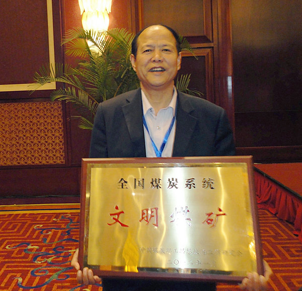 陳家山礦黨委書記暢永光領(lǐng)取全國文明煤礦獎牌