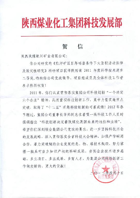 近日,銅川礦業(yè)公司《焦坪礦區(qū)巨厚礫巖條件下大面積活動(dòng)規(guī)律及致災(zāi)性研究》科研項(xiàng)目獲得陜西省2011年度科學(xué)技術(shù)進(jìn)步二等獎(jiǎng)。陜煤化集團(tuán)科技發(fā)展部欣聞公司《焦坪礦區(qū)厚礫巖條件下大面積活動(dòng)規(guī)律及致災(zāi)性研究》榮獲2011年度陜西省科學(xué)技術(shù)二等獎(jiǎng)的消息后,專門給銅川礦業(yè)公司發(fā)來賀信,向公司黨政領(lǐng)導(dǎo)、項(xiàng)目組成員及全體科技工作者表示熱烈的祝賀。