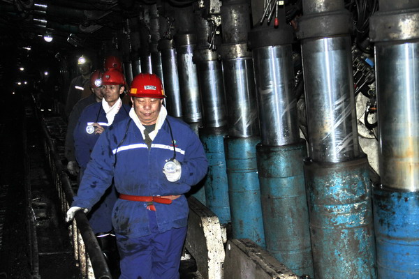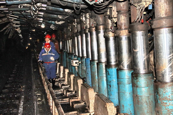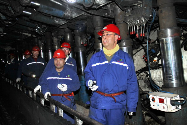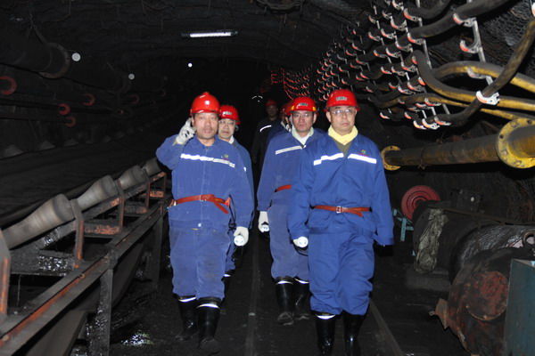 黃河書(shū)記到礦后,首先向該礦黨政主要領(lǐng)導(dǎo)仔細(xì)詢(xún)問(wèn)了該礦目前的安全生產(chǎn)和煤炭銷(xiāo)售及經(jīng)營(yíng)狀況。黃書(shū)記十分關(guān)心該礦的煤炭質(zhì)量及銷(xiāo)售情況,聽(tīng)取有關(guān)情況后,立即帶領(lǐng)隨行人員到該礦儲(chǔ)煤場(chǎng)現(xiàn)場(chǎng)察看了煤炭存量和煤質(zhì)情況。為了進(jìn)一步了解掌握實(shí)際情況,上午10時(shí)30分左右,黃河書(shū)記又帶領(lǐng)隨行人員更衣下井,與該礦黨政主要領(lǐng)導(dǎo)一同深入正在生產(chǎn)的422綜采工作面,對(duì)系統(tǒng)特別是綜采工作面的地質(zhì)變化及運(yùn)行狀況進(jìn)行了認(rèn)真詳細(xì)的調(diào)查了解。