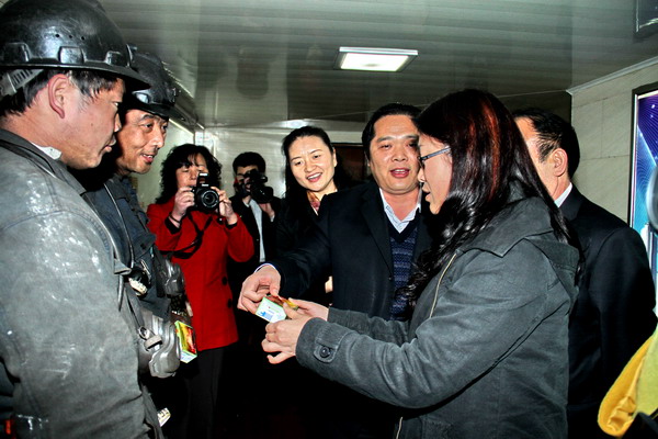 下午3時許,黨柏峰、梁秀俠一行到礦后,欣聞該礦四點班職工將要更衣入井、八點班的職工即將升井,正是“礦嫂服務(wù)隊”開展活動、展現(xiàn)風(fēng)采的時機。他們帶著十分好奇與興奮的心情,沒顧得上考慮休息,就立即趕到井口,投入對“礦嫂服務(wù)隊”進(jìn)行現(xiàn)場采訪與親歷她們的活動之中。他們經(jīng)過井口文化長廊,來到礦嫂服務(wù)活動現(xiàn)場,當(dāng)看到一個個身披“礦嫂安全親情服務(wù)隊”標(biāo)志,著裝整齊規(guī)范、滿面笑容,正在為上下井職工熱情服務(wù)的礦嫂們,黨柏峰、梁秀俠一行激動地與她們一一握手,向她們問好。在活動間隙,黨柏峰、梁秀俠一行不失時機與礦嫂們和上下井職工親切交談,了解有關(guān)情況。