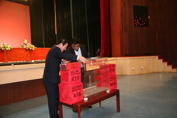 銅川礦業(yè)公司機(jī)關(guān)選區(qū)選舉大會(huì)嚴(yán)格按照各項(xiàng)程序進(jìn)行。首先,機(jī)關(guān)事務(wù)中心黨總支書記楊掌印同志宣讀授權(quán)書。奧博集團(tuán)黨委副書記、紀(jì)委書記、工會(huì)主席孫祥春同志宣讀《區(qū)人大代表選舉辦法》,機(jī)關(guān)工委副書記南民生同志宣讀本選區(qū)區(qū)人大代表正式候選人名單。機(jī)關(guān)工委副書記孫曉明同志宣讀本選區(qū)王益區(qū)第九屆人民代表大會(huì)代表投票選舉法(草案)。接著,工作人員認(rèn)真清點(diǎn)到會(huì)選民人數(shù)和委托選民人數(shù)。全體選民舉手通過總監(jiān)票人、監(jiān)票人、總計(jì)票人、計(jì)票人名單。監(jiān)票人楊掌印、孫祥春檢查票箱,公開透明。主持人秦文俊說明寫票注意事項(xiàng)。然后,全體選民進(jìn)行了認(rèn)真投票,把自己神圣的一票投給自己相信的人。