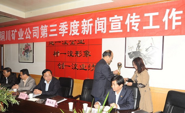 會上,各單位分別匯報了本單位第三季度新聞宣傳報道情況,陳家山礦黨委宣傳部部長魯耀中介紹了該礦今年以來特別是第三季度爭創(chuàng)新聞報道工作優(yōu)勝單位的經(jīng)驗,公司黨委宣傳部新聞宣傳干事、網(wǎng)站編輯魚聰玲、劉孝文,銅川礦工報編輯、記者王忙鎖分別就陜煤銅川網(wǎng)升級改版情況、各單位對外宣傳報道工作存在問題及對策,銅川礦工報來稿、用稿及第四季度新聞報道要點等情況進行了通報。與會領(lǐng)導為榮獲中國煤炭新聞網(wǎng)2010年度新聞報道工作先進集體的陳家山礦、下石節(jié)礦、金華山礦、鐵路運銷分公司、物資供應分公司5個單位代發(fā)了獎牌,為榮獲公司第三季度新聞報道工作優(yōu)勝單位的陳家山礦、鐵路運銷分公司、建安社區(qū)管理中心3個單位頒發(fā)了流動獎杯。