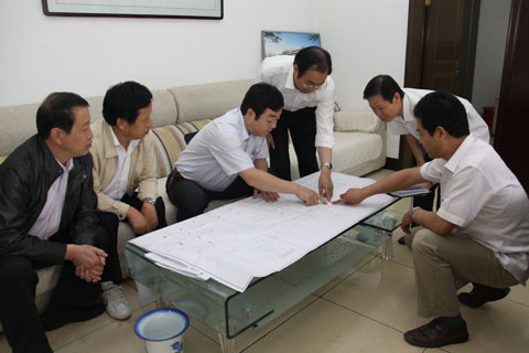 圖為:副局長劉水利、副總吳新科、生產(chǎn)處長賈林安與鴨口公司黨政該綜采工作面接續(xù)情況及老面回收情況進(jìn)行討論。