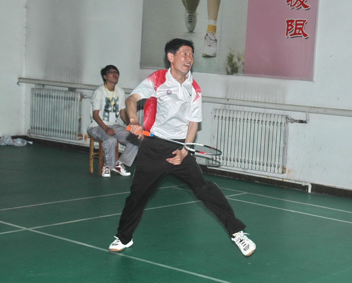 領(lǐng)導(dǎo)干部組單打比賽冠軍——王家河社區(qū)管理中心李忠寶在賽場(chǎng)上