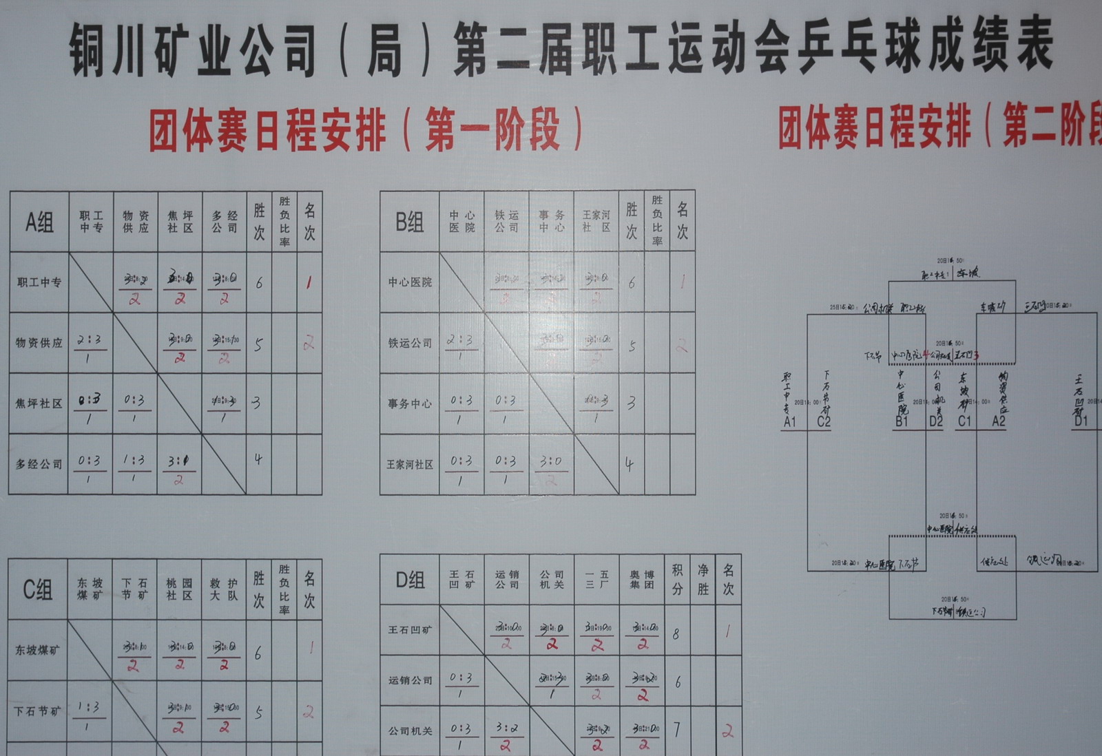 本次乒乓球比賽從19日開始到21日結(jié)束,競賽項目有職工組混合團體、男子單打、女子單打和領(lǐng)導(dǎo)干部組單打,共有22個代表隊144名隊員參賽。其中職工組混合團體賽采用分組循環(huán)制,共有參賽隊17個進行八輪40場比賽;單打賽均采用淘汰制,領(lǐng)導(dǎo)干部組單打共27人進行31場比賽,職工組男子單打共55人進行59場比賽,職工組女子單打共45人進行41場比賽。