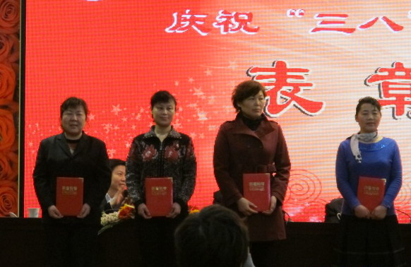 礦區(qū)工會女工主任翟永俠等手持“先進女職工委員會”獎牌在會場合影留念