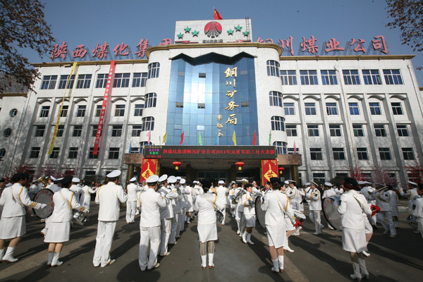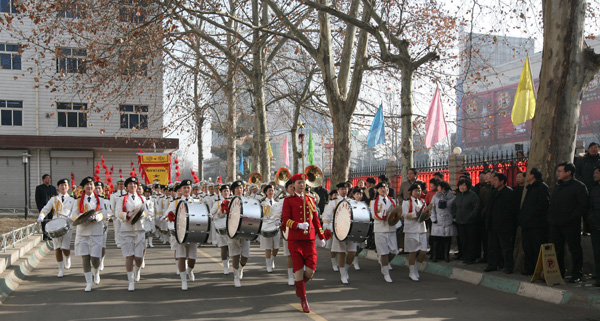 礦區(qū)工會副主席梁桂香宣布表演開始。在震耳的鞭炮聲中,局“三會”描繪的“十二五”宏偉藍(lán)圖仿佛浮現(xiàn)在我們的眼前。伴隨著嘹亮的軍樂,我們的工人軍樂隊威武走來。供應(yīng)處黨政組織在搞好礦井物質(zhì)供應(yīng)工作的同時,注重職工群眾文化團(tuán)體建設(shè),在局黨政的大力支持和扶植下,成立了一支高質(zhì)量、高標(biāo)準(zhǔn)的百人軍樂隊,把軍樂隊作為一種創(chuàng)新,一種文化重點來培養(yǎng),讓職工在學(xué)會“洋器”、掌握本領(lǐng)、展現(xiàn)自我中快樂工作,奉獻(xiàn)企業(yè)。同時提高了人員素質(zhì),享受了美好的生活,充分彰顯了我局企業(yè)文化建設(shè)的成果,為我局贏得了榮譽(yù)。