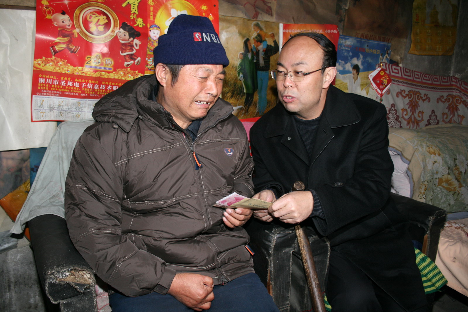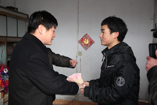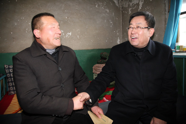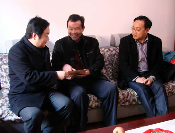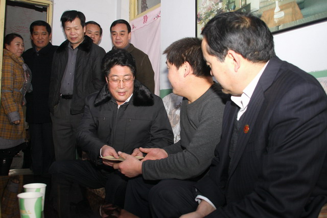 從劉曉東家出來(lái),宋志剛局長(zhǎng)一行,踏著路面的積冰,走過(guò)難行的家屬區(qū)小巷,來(lái)到了房屋低矮的玉華煤礦運(yùn)轉(zhuǎn)隊(duì)職工史擁軍家門前??吹皆陂T口迎接的史擁軍,宋局長(zhǎng)快步走上前去,親切地握住史擁軍的手,拉著他一同走進(jìn)光線昏暗的房屋,坐下來(lái)問(wèn)寒問(wèn)暖,詢問(wèn)家庭生活情況,了解孩子上學(xué)就業(yè)事宜。隨后,宋局長(zhǎng)把代表公司黨政關(guān)懷之意的慰問(wèn)金,送到史擁軍手上,代表組織在春節(jié)來(lái)臨之際,并向奮戰(zhàn)在煤炭生產(chǎn)戰(zhàn)線的困難職工,表示親切的慰問(wèn)和美好的祝福。