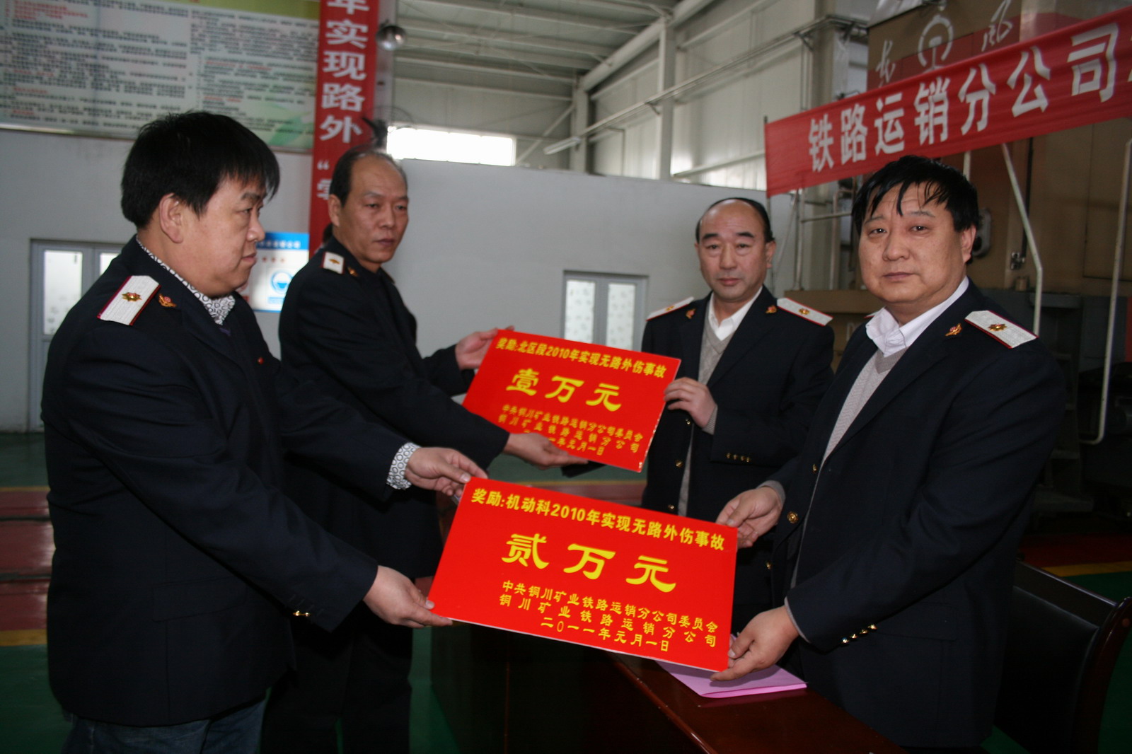 鐵路運(yùn)銷分公司經(jīng)理孫建軍、黨委書(shū)記高德富為在安全工作中做出突出貢獻(xiàn)的公司機(jī)動(dòng)科和北區(qū)段頒發(fā)獎(jiǎng)金