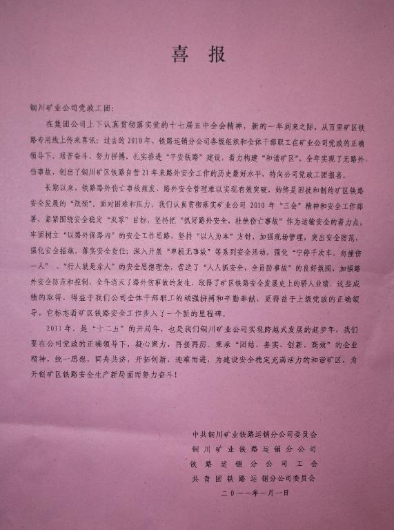 新年伊始,從百里礦區(qū)鐵路專用線上傳來(lái)喜訊:在剛剛過(guò)去的2010年,鐵路運(yùn)銷分公司全年實(shí)現(xiàn)了無(wú)路外傷及以上事故,創(chuàng)出了銅川礦區(qū)鐵路自營(yíng)21年來(lái)路外安全工作的歷史最好水平。