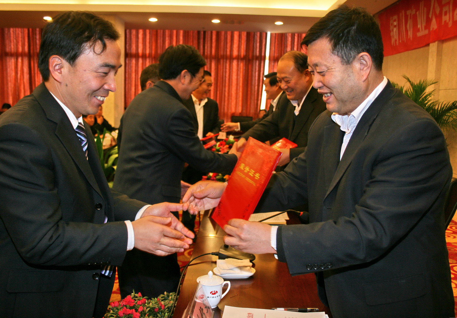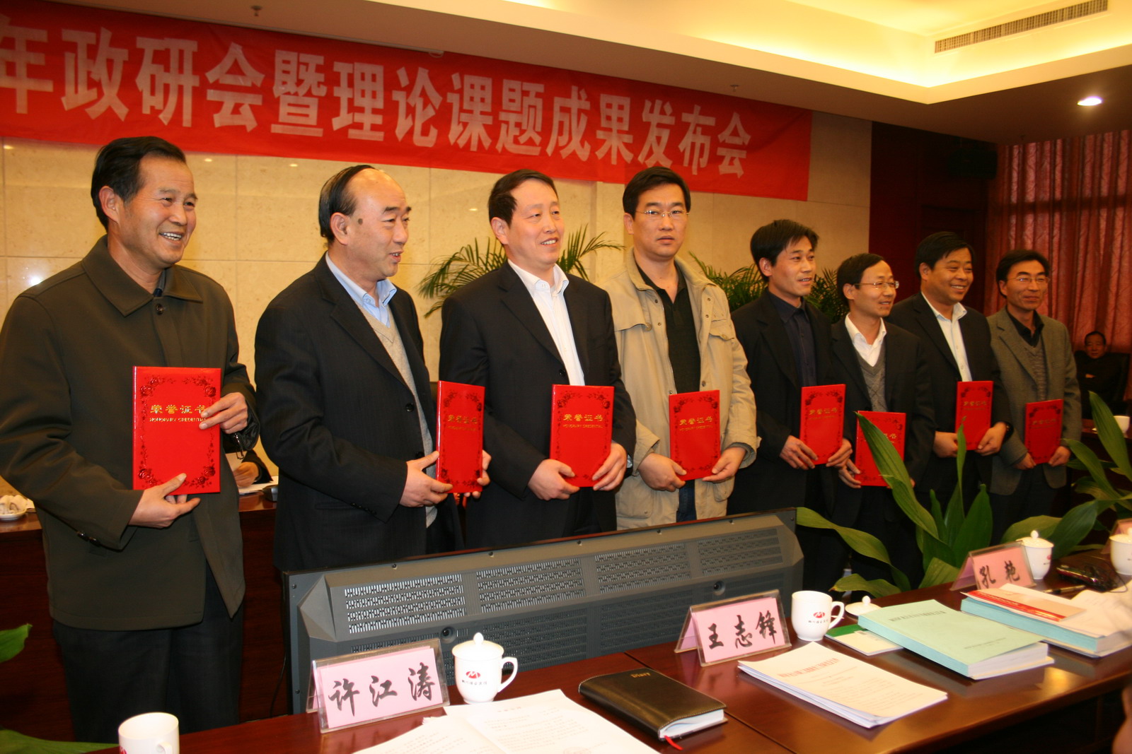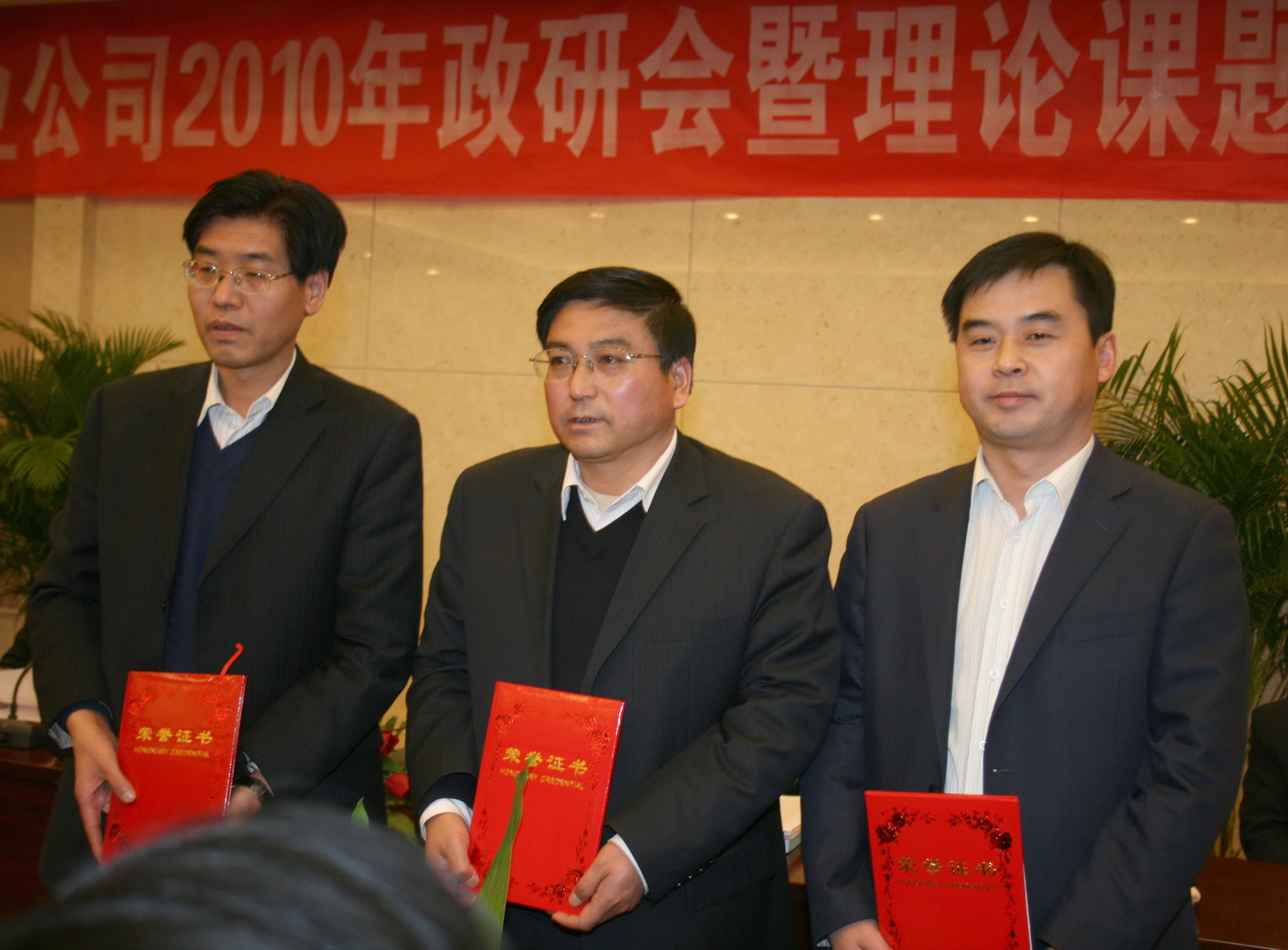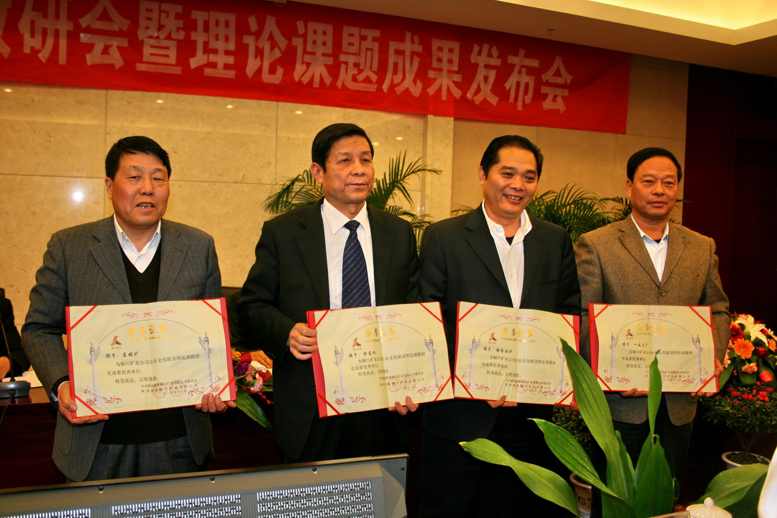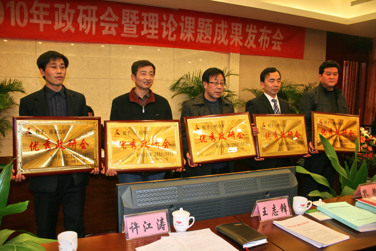 礦區(qū)工會主席張仿文宣讀了《銅川礦業(yè)公司政研會關(guān)于表彰優(yōu)秀政研會暨四項課題研究成果和優(yōu)秀論文的決定》。陳家山礦、王石凹礦、鴨口礦、供應(yīng)處和桃園社區(qū)等5個單位獲優(yōu)秀政研會。共評出優(yōu)秀論文16篇,其中,一等獎3篇,二等獎4篇,三等獎8篇,特別獎1篇。四項課題研究成果分別是“論塑造本質(zhì)安全型員工的科學(xué)內(nèi)涵及其保障體系建設(shè)”、“銅煤企業(yè)文化的內(nèi)涵及運行狀態(tài)”、“銅川礦務(wù)局‘三型六化’大創(chuàng)建格局體制建設(shè)縱覽”和“安全文化理念轉(zhuǎn)化變?yōu)榘踩袨椤?。隨后,在一片熱烈的掌聲中,公司領(lǐng)導(dǎo)李志科、張志文、張仿文分別向獲獎單位和個人頒發(fā)了獎牌、榮譽證書。