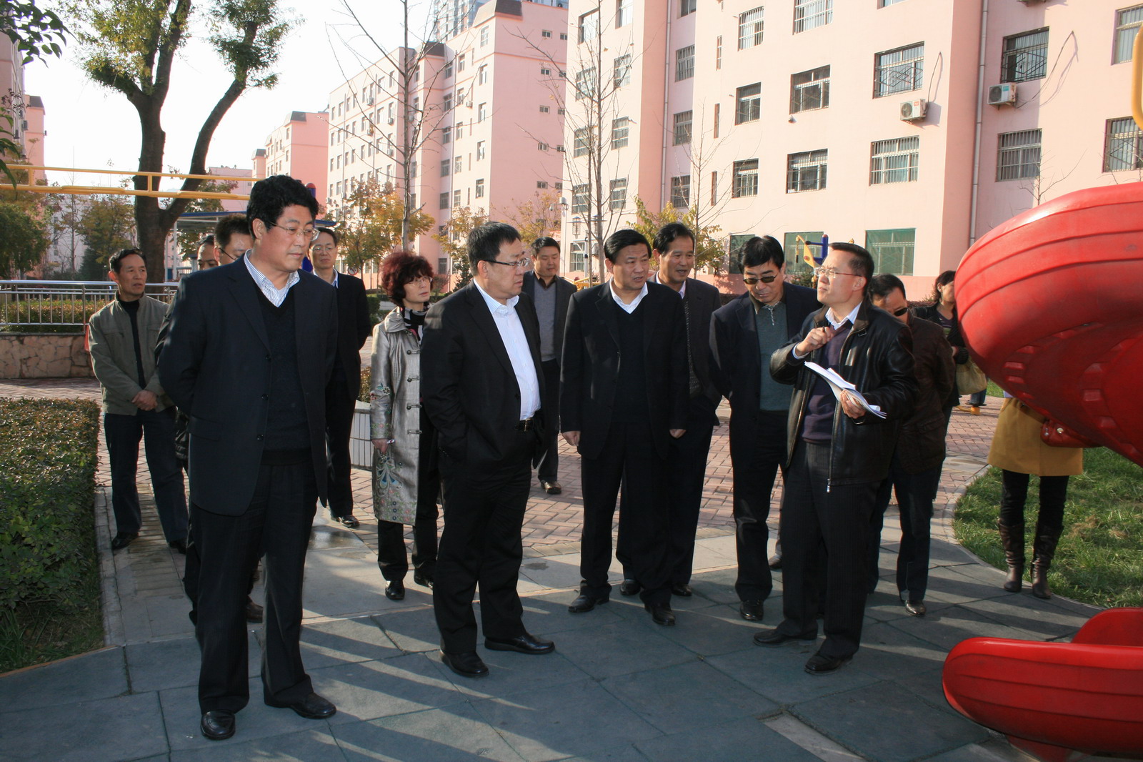 為了確保該“文化園”建設(shè)達到預(yù)期效果,當天下午,局長宋志剛、公司黨委副書記、紀委書記張志文、副局長郭寶輝一行與有關(guān)部門、單位負責人一同深入到梅苑小區(qū),對該小區(qū)進行了全面考察,并就“文化園”建設(shè)和小區(qū)的進一步改造現(xiàn)場進行了研究。從小區(qū)后門到前門,從小區(qū)的北邊到南邊,從小區(qū)路面建設(shè)到綠化、景觀建設(shè),從小區(qū)的文化健身活動設(shè)施、場地到整體與局部的色調(diào)處理,從垃圾箱的擺放位置到小區(qū)的角角落落,宋志剛局長仔細全面的察看了每一個細節(jié),并提出了新的更高的設(shè)計施工要求。宋局長強調(diào)“文化園”建設(shè)要“高標準、上檔次、有品位”,要突出人文關(guān)懷、人文景觀,以造福職工家屬,讓大家真正感受到溫馨、快樂、幸福。具體要做到,既加大硬件投入,又提高職工家屬和居民的整體素質(zhì),還要進一步豐富活躍小區(qū)文化娛樂活動。
