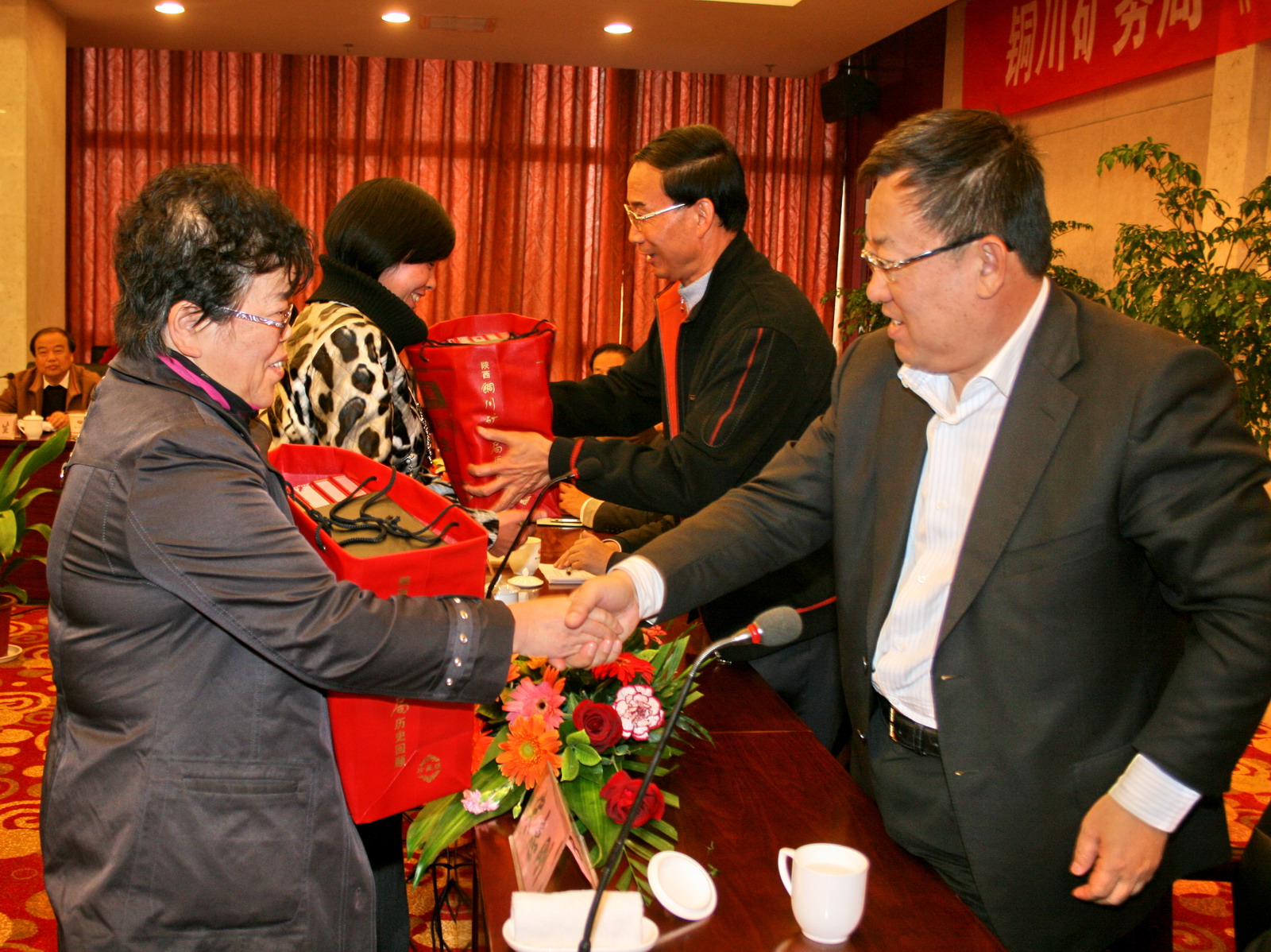局黨委常委、礦區(qū)工會主席張仿文為勞模代表徐殿明頒發(fā)畫冊