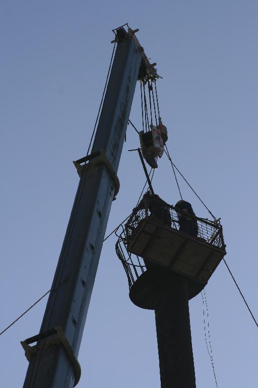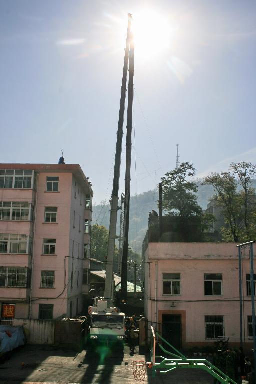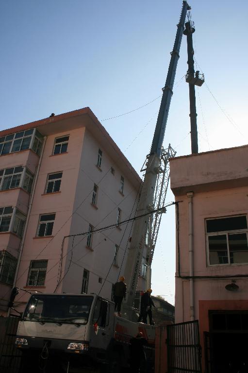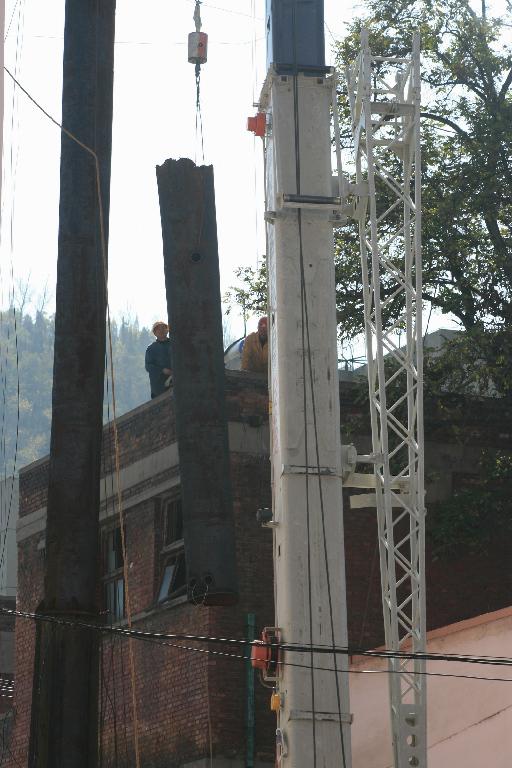 接到通知后,華瑞公司立即拿出可行性方案。第一套是打25噸水泥基礎(chǔ),用塔吊拆除。但此方案連施工帶水泥凝固,需要一周時間,安裝又要5天,前后要半個月的時間。郭局長說:此方案,成本大,工期長,影響供暖?,F(xiàn)在既要保證安全,又不能影響供暖,讓居民的正常生活不被打亂。此方案被否決了。華瑞公司經(jīng)過認(rèn)真研究,拿出了第二套方案。把大門門樓的地面挖開,鑿出能容塔吊進(jìn)入的道路,將一臺30噸的塔吊駛?cè)?,工作人員通過塔吊施工,加快工程進(jìn)度,用最快的速度拆除傾斜的煙囪,解除安全隱患。