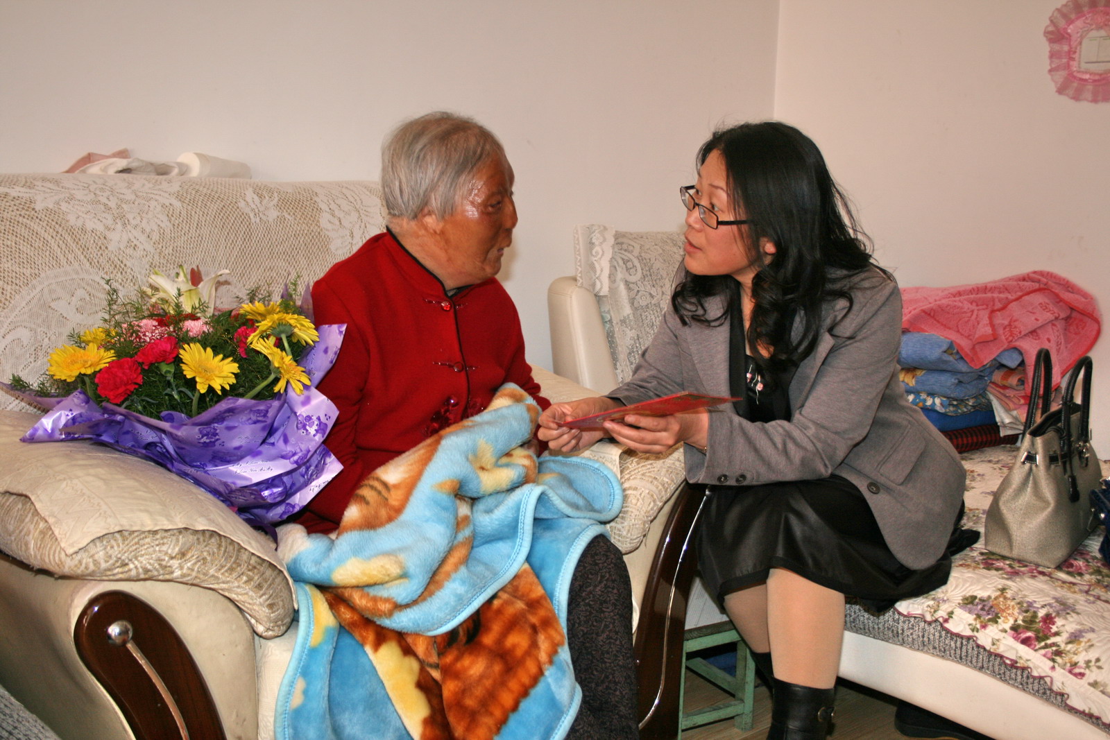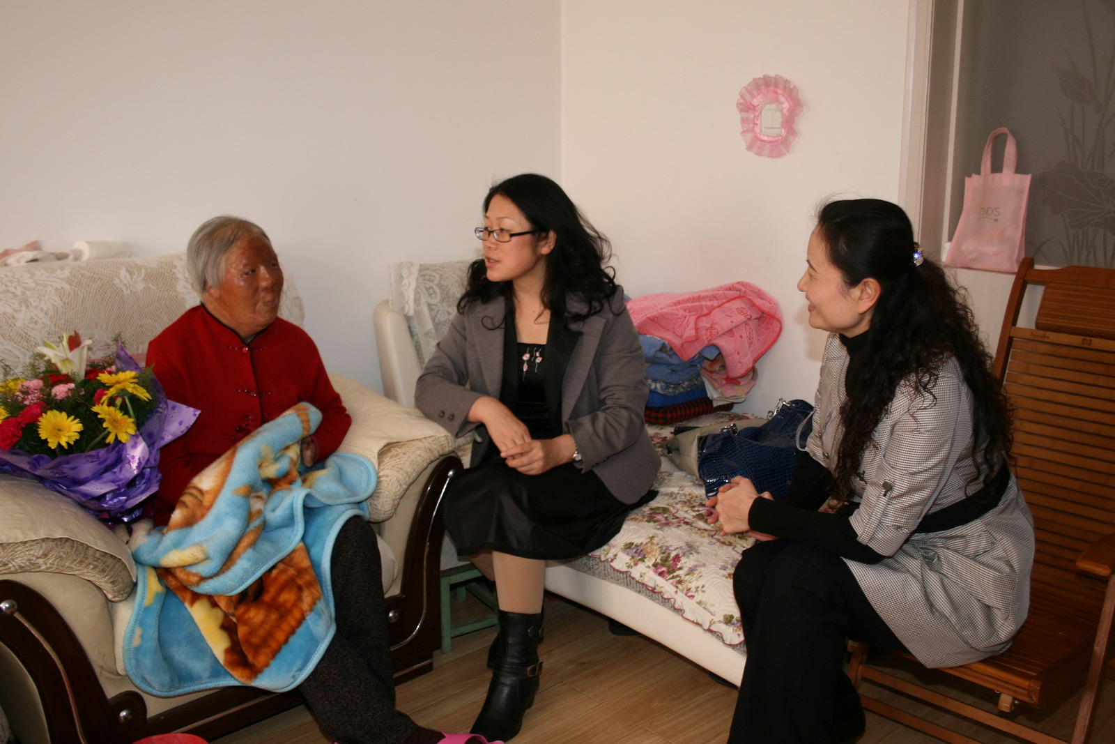 梁秀俠與馮玉萍老人促膝交談