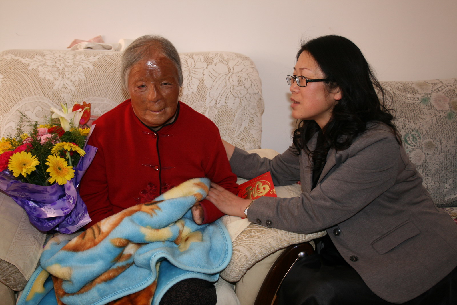 看到馮玉萍老人曾經(jīng)燒傷的臉龐與殘缺的手臂,回憶起她當(dāng)年為保護(hù)國家財產(chǎn)和井下工友生命安全所作出的英雄壯舉,梁秀俠及隨行人員十分感慨和敬慕。梁秀俠代表組織向老人送上一束鮮花和1000元現(xiàn)金,還帶來米、面、油等慰問品。她和隨行人員圍坐在老人身旁,與老人親切交談。梁秀俠十分激動地對馮玉萍老人說:您的事跡我們都知道,您是我們銅川婦女的驕傲和自豪,是我們廣大婦女和職工學(xué)習(xí)的楷模。組織永遠(yuǎn)記著您,今天就是借重陽節(jié)這個老年人自己的節(jié)日,我們專門來看看您老人家,我們一定向您學(xué)習(xí),向您致敬!也祝您老人家身體健康,生活幸福愉快!