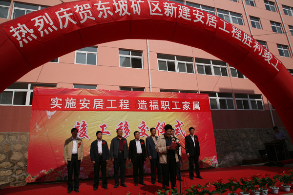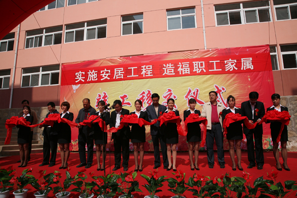 出席竣工儀式的局級(jí)黨政領(lǐng)導(dǎo)宋志剛、杜樹山、李志科、薛鳴、郭寶輝和礦上領(lǐng)導(dǎo)為安居工程剪彩,并向新住戶代表發(fā)放了新居鑰匙。