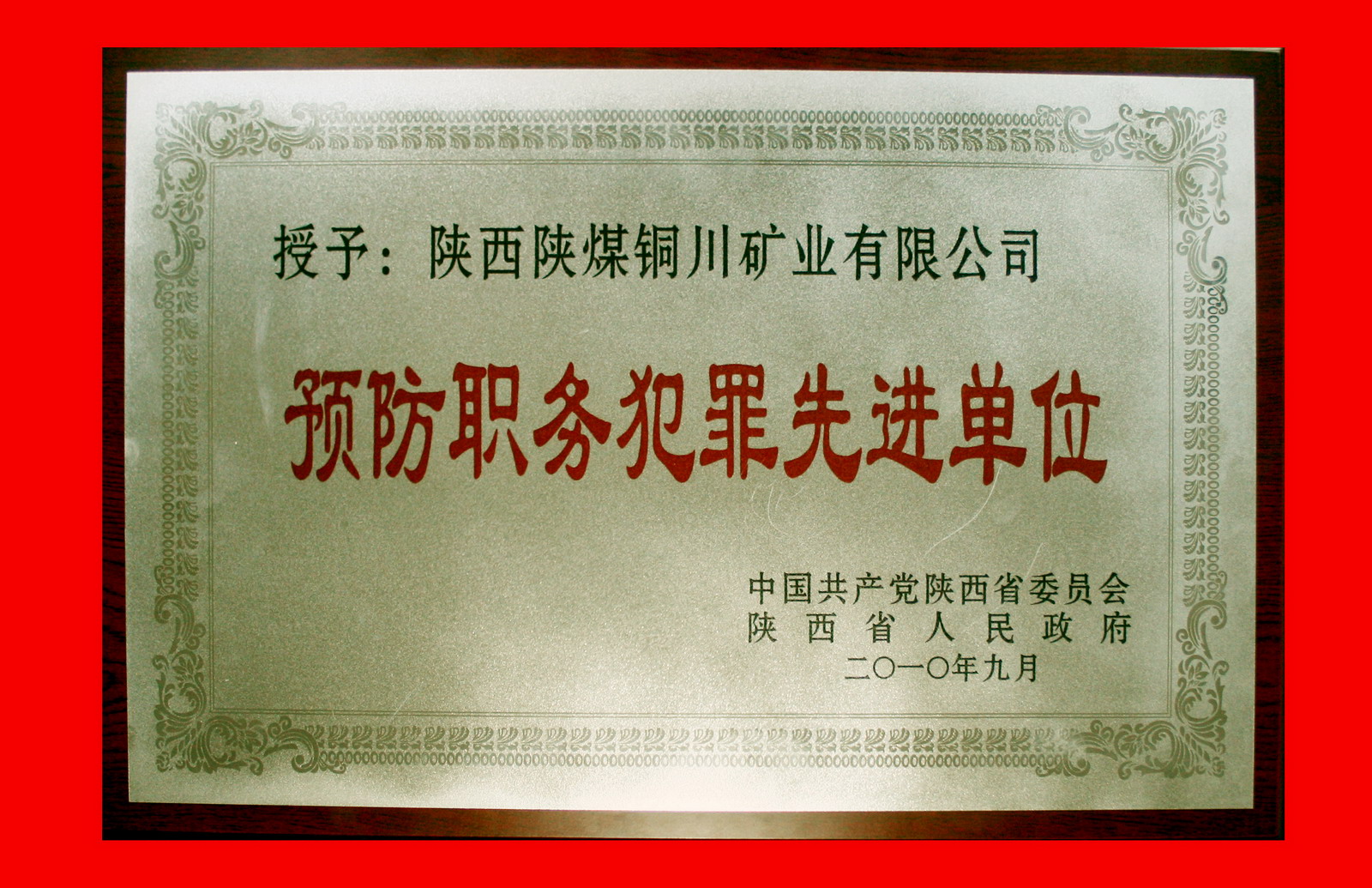 在9月27日召開的陜西省第九次預(yù)防職務(wù)犯罪聯(lián)席會議上,銅川礦業(yè)公司被陜西省委、省政府授予“預(yù)防職務(wù)犯罪先進單位”榮譽稱號,該公司關(guān)于構(gòu)建符合銅煤特點的預(yù)防職務(wù)犯罪體系的經(jīng)驗做法得到一致好評