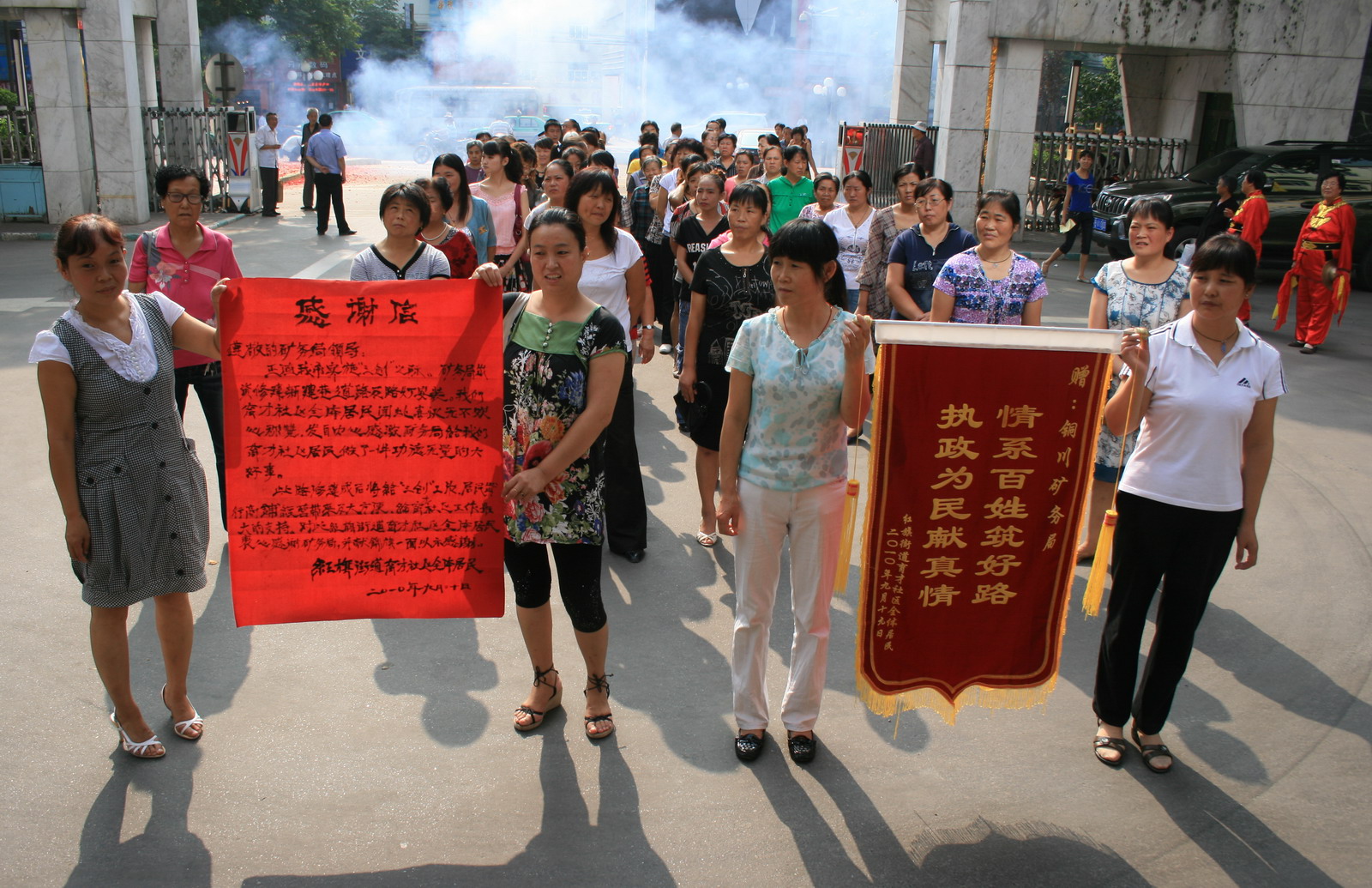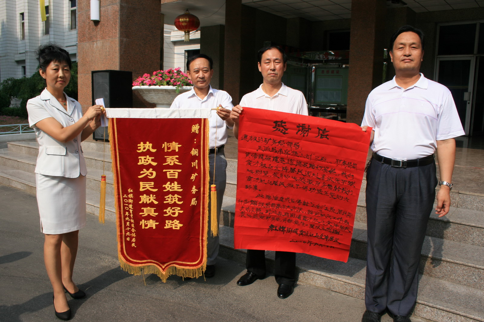 9月20日上午,局機(jī)關(guān)大院鑼鼓喧天,鞭炮齊鳴,熱鬧非常。銅川市王益區(qū)紅旗街育才社區(qū)數(shù)百名群眾手捧感謝信和寫有“情系百姓筑好路,執(zhí)政為民顯真情”字樣的鮮紅錦旗,滿懷喜悅地來(lái)到礦務(wù)局機(jī)關(guān)大院,感謝局黨政替老百姓著想,投資修建年久失修、關(guān)系民生的新建巷道路。