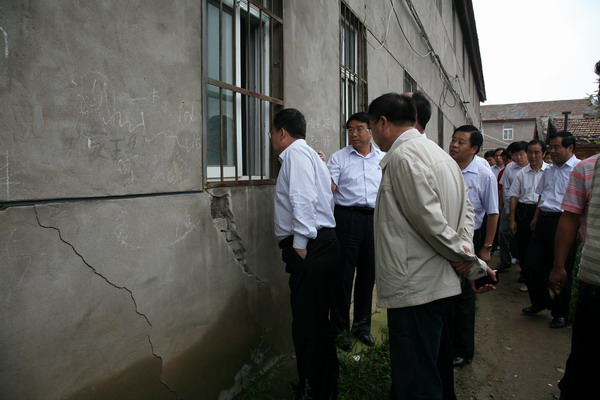 踏著泥濘察看受災(zāi)房子,局領(lǐng)導(dǎo)下決心解決群眾的居住問題