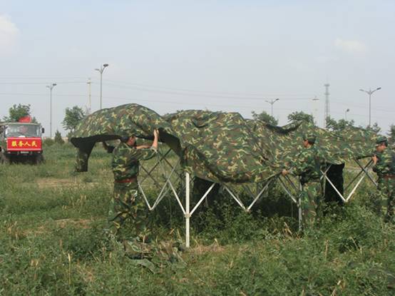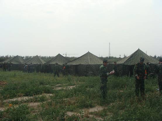 指揮連(應(yīng)急分隊)一排一班負(fù)責(zé)外圍警戒,其余各排、班分別卸下各自行囊,拉開架勢開始大干。在供應(yīng)處(預(yù)備役)炊事班迅速開始埋鍋造飯的同時,其它各班紛紛動手搭建帳篷……。不一會,炎熱的太陽下,空曠的草地里便升起了裊裊炊煙,矗立起一排整齊有序的軍帳。隨后,141師檢查團(tuán)成員集合隊伍,先后進(jìn)行檢查、指導(dǎo)、點驗,對本次演練表示滿意,并鼓勵大家再接再厲。