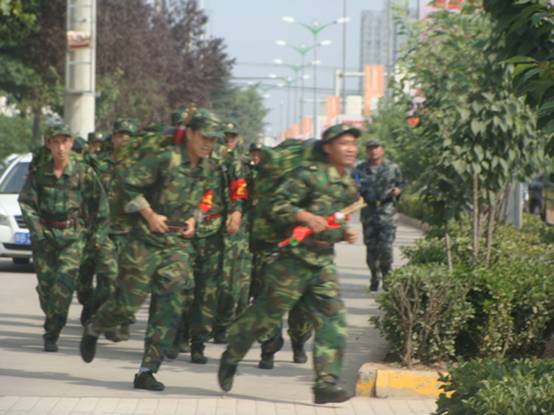車隊到達(dá)銅川市新區(qū)廣場后,參演官兵全部下車集合,接受命令后,攜帶行囊跑步行進(jìn)2.5公里,再次登車向目據(jù)地進(jìn)發(fā)。行車5公里后,來到新區(qū)坡頭鎮(zhèn)集結(jié)地,開始實施宿營演練。