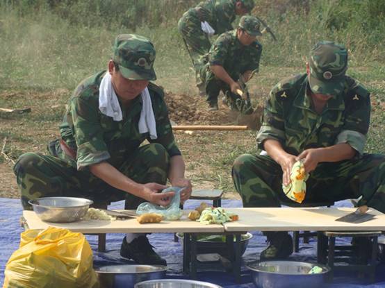 5時45分,以各班為單位,指戰(zhàn)員圍坐一圈開始就餐。主食是大米飯、燒餅,加上燒炒的土豆絲、苦瓜、油麥菜、辣子炒魚肉及西紅柿雞蛋湯也夠得上四菜一湯,指戰(zhàn)員吃著、笑著,仿佛一天的勞累被一掃而光。
