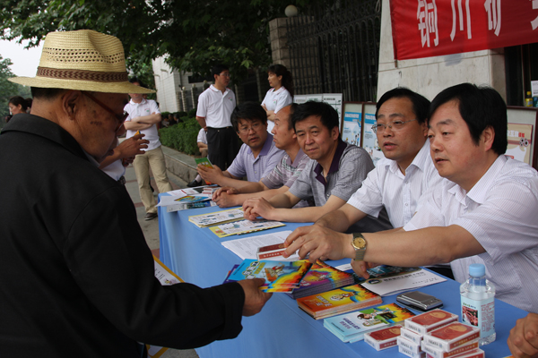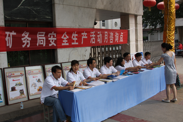 6月13日清早,銅川礦業(yè)公司安監(jiān)局就走上街頭進行宣傳。他們定制了“安全發(fā)展,預防為主”主題宣教掛圖、礦山安全技術、煤礦“一通三防”、煤礦救災、避災,煤礦應急救援預案,三項建設等60多個宣傳版牌,圖文并茂,引得過往行人駐足觀看。分發(fā)了用電安全、社區(qū)安全、家庭安全、建筑安全宣傳彩頁1000份,發(fā)放生產經營單位從業(yè)人員安全知識、消防安全知識、高處作業(yè)安全知識、事故現場應急與緊急救護、建筑施工安全知識等手冊1000余份。特別印制了安全月主題撲克,里面將每年的安全月主題都印刷上,并印上安全注意事項等等,形式新穎,寓教于樂。銅川礦務局副局長、安監(jiān)局長劉水利親自走上街頭,發(fā)放宣傳單,以自己的實際行動關注安全。