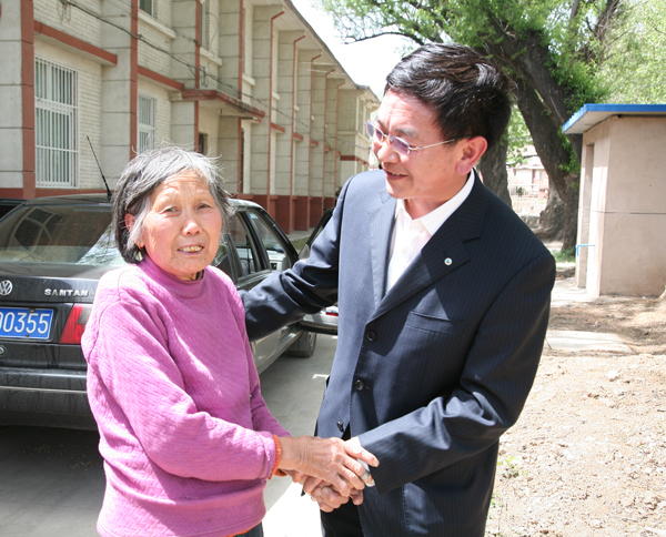 (老太太拉著社區(qū)主任趙坤貴的手說(shuō) :“感謝領(lǐng)導(dǎo)給予的關(guān)懷”)