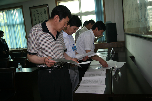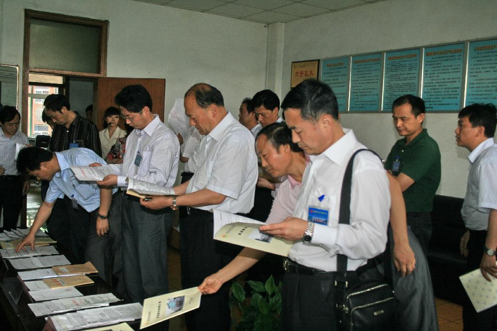 與會(huì)人員查看下石節(jié)礦班組建設(shè)有關(guān)資料
