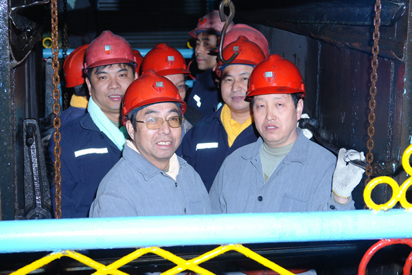 鴨口公司董事長兼總經(jīng)理張會(huì)縣、黨委書記蘭阿利與局有關(guān)人員深入井下組織排水