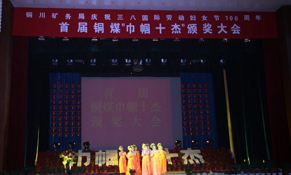 銅川礦工俱樂部張燈結彩,喜氣洋洋。此次首屆銅煤“巾幗十杰”頒獎大會采取邊演出邊頒獎的形式,情景交融,既讓礦務局三千余名女工的杰出代表精彩亮相,又讓大家欣賞了一臺格調(diào)高雅的文藝演出。局在家的領導杜樹山、宋志剛、李志科、張志文、張仿文、黃河、劉水利、薛鳴、封建利等與廣大職工、女工代表、機關處室負責人等歡聚一堂,慶祝節(jié)日,欣賞節(jié)目,并登臺向“巾幗十杰”頒獎。