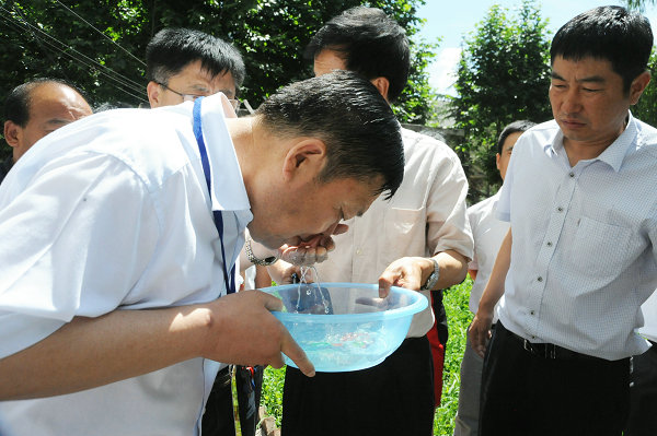 張應龍一行到該礦生活處理污水站,對水質(zhì)在線監(jiān)測數(shù)據(jù)傳輸、污水處理工藝、相關設備的運行情況進行了實地查看,并就污水處理細節(jié)問題與陪同人員進行了深入交流。在污水處理排水口,張應龍親自盛滿一盆水,在陽光下仔細查看水樣,當看到清澈如鏡的水樣,不住點頭稱贊。