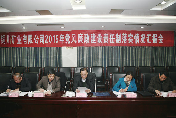 公司黨委書記郭寶輝代表公司黨政領(lǐng)導班子就公司2015年黨風廉政建設責任制落實情況作了匯報。他指出,今年以來,在集團公司的正確領(lǐng)導下,銅川礦業(yè)公司以黨的十八大、十八屆四中、五中和中紀委四次、五次全會精神為指導,緊緊圍繞企業(yè)改革發(fā)展和穩(wěn)定工作大局,堅持“黨委統(tǒng)一領(lǐng)導,黨政齊抓共管,紀委組織協(xié)調(diào),部門各負其責,依靠職工群眾支持參與”的反腐敗領(lǐng)導體制和工作機制,按照“四零”工作思路,以“三嚴三實”教育活動為契機,以全面落實黨風廉政建設“兩個責任”為主線,以“監(jiān)督執(zhí)紀問責”主題年活動為抓手,把黨風廉政建設工作融入到企業(yè)各項工作之中,公司黨風廉政建設責任制呈現(xiàn)出強化責任擔當,黨委主體責任和紀委監(jiān)督責任穩(wěn)步推進;精心安排部署,促進黨風廉政建設責任制的常態(tài)化落實;踐行“三嚴三實”,為公司轉(zhuǎn)型發(fā)展、二次創(chuàng)業(yè)提供了堅強的政治保障;聚焦中心任務,強化監(jiān)督執(zhí)紀問責主題年活動扎實有效;加大紀律審查,“零容忍”懲治腐敗的高壓態(tài)勢不減;狠抓源頭治理,懲治和預防腐敗體系不斷完善;狠抓自身建設,保障黨風廉政建設順利開展;堅持以人為本,各項工作在逆境中穩(wěn)步推進等八個方面的特點,為建設富裕文明和諧美麗礦區(qū)提供了堅強的政治保證和紀律保障。公司在安全生產(chǎn)、經(jīng)營管理、重點工程、企業(yè)改革、黨的建設、文化建設、民生工程等方面均取得了較好的成績,1-10月份累計生產(chǎn)原煤820萬噸,銷售煤炭823萬噸,累計完成掘進進尺35802米,完全成本比計劃降低48.88元,杜絕了較大及以上生產(chǎn)安全責任事故和重大涉險責任事故。在認真分析一年來黨風廉政建設工作中存在的問題和不足的基礎上,郭寶輝從開展黨風廉政建設“兩個責任”落實主題年活動;深入學習貫徹落實新版《中國共產(chǎn)黨廉潔自律準則》和《中國共產(chǎn)黨紀律處分條例》;嚴肅紀律審查,切實解決發(fā)生在職工群眾身邊的腐敗問題;創(chuàng)新廉潔文化建設載體;改革紀檢監(jiān)察體制機制;創(chuàng)新監(jiān)督平臺和載體;深入貫徹落實公司黨政加強作風建設“四改進四倡導四帶頭四滿意”的要求;按照“三轉(zhuǎn)”要求,聚焦黨風廉政建設和反腐倡廉中心任務,集中精力監(jiān)督執(zhí)紀問責等八個方面對2016年公司黨風廉政建設工作思路及重點工作進行了匯報。