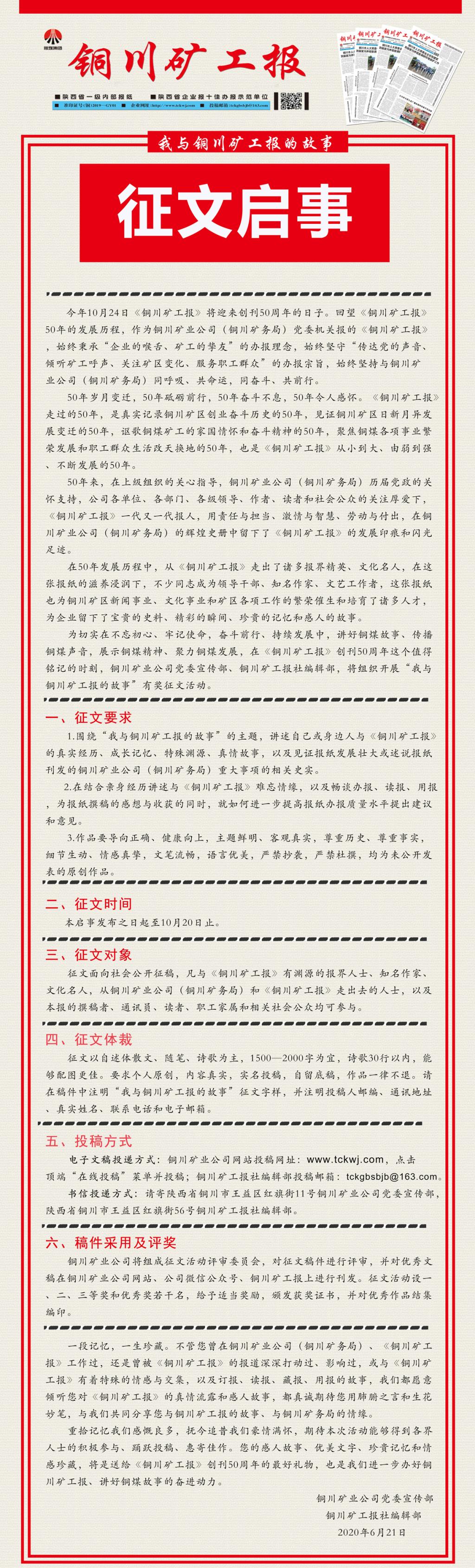 為切實(shí)以紀(jì)念《銅川礦工報(bào)》創(chuàng)刊50周年為契機(jī),通過回望《銅川礦工報(bào)》50年的發(fā)展歷程,展示《銅川礦工報(bào)》與銅川礦業(yè)公司(銅川礦務(wù)局)同呼吸、共命運(yùn),同奮斗、共前行的故事,進(jìn)一步傳播銅煤聲音,聚力銅煤發(fā)展,公司將啟動(dòng)“我與銅川礦工報(bào)的故事”主題征文活動(dòng),敬請(qǐng)公司各單位和社會(huì)各界關(guān)注參與、踴躍投稿。