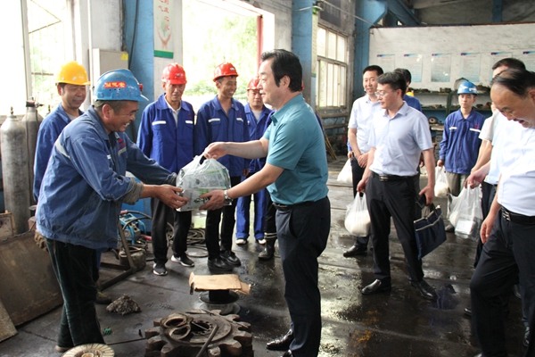 在玉華礦機(jī)修廠,劉水利向堅(jiān)守崗位、辛勤工作的干部職工問好,代表公司黨政對(duì)他們的辛勤工作表示衷心的感謝,并向他們送去白糖、茶葉、綠豆等降溫品,同時(shí)關(guān)切詢問他們的工作和生活情況,告誡大家增強(qiáng)安全意識(shí),做好防暑降溫,合理安排工作,適當(dāng)調(diào)整狀態(tài),勞逸結(jié)合,規(guī)律作息,以充沛的精力和良好的狀態(tài)投入工作,并勉勵(lì)大家努力把生產(chǎn)搞上去、把效益提上去,促進(jìn)各項(xiàng)工作取得新業(yè)績。