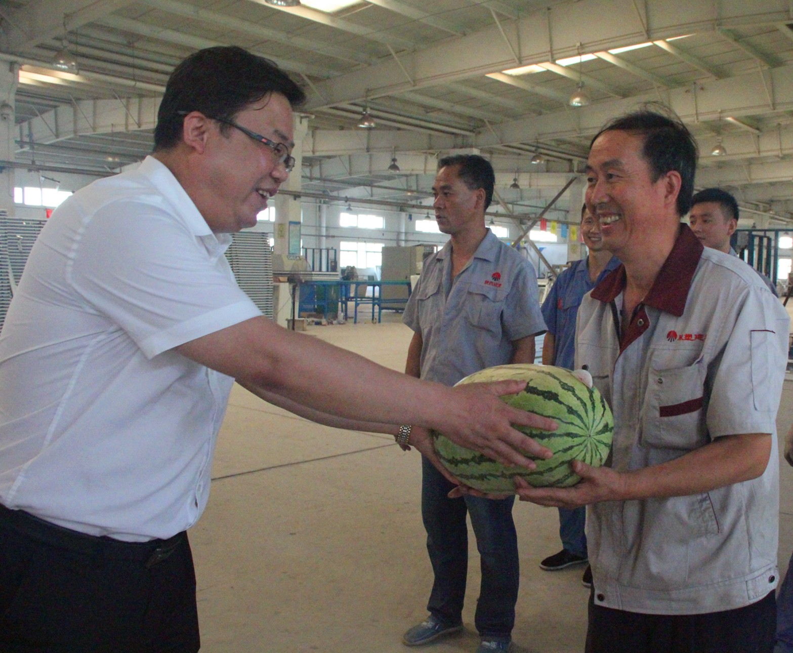 8月4日,公司總經(jīng)理助理梁銳帶領(lǐng)公司有關(guān)部門負(fù)責(zé)同志深入欣塑公司生產(chǎn)車間,看望奮戰(zhàn)在一線的職工,并為他們送去西瓜、礦泉水、茶葉、白糖等防暑降溫品。