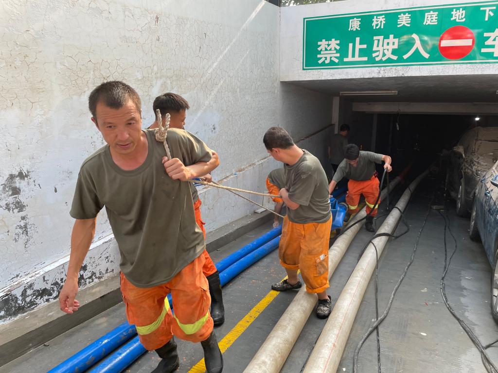 7月24日,按照指揮部安排,救援隊(duì)赴新鄉(xiāng)市牧野區(qū)康橋美庭小區(qū)地下車庫進(jìn)行排澇?,F(xiàn)場勘查后,發(fā)現(xiàn)該小區(qū)地下車庫已全部被水淹沒,車輛疊放在地下車庫進(jìn)出口通道,給救災(zāi)帶來極大困難,并發(fā)現(xiàn)小區(qū)門口還有一大型地下超市,由于雨水倒灌,超市也已全部被淹,救援第一役的戰(zhàn)斗就此打響。
