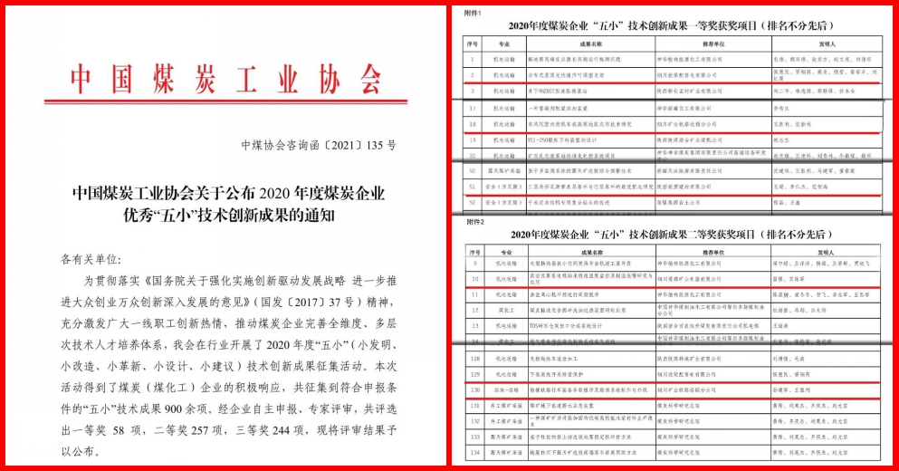 近日,從中國(guó)煤炭工業(yè)協(xié)會(huì)傳來(lái)喜訊,2020年度全國(guó)煤炭企業(yè)“五小”技術(shù)創(chuàng)新成果評(píng)選結(jié)果揭曉,共評(píng)選出一等獎(jiǎng)58項(xiàng),二等獎(jiǎng)257項(xiàng),三等獎(jiǎng)244項(xiàng)。其中公司6項(xiàng) “五小”技術(shù)創(chuàng)新成果3項(xiàng)榮獲一等獎(jiǎng),3項(xiàng)榮獲二等獎(jiǎng)。