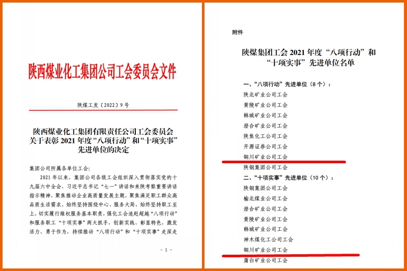 在深入開展“八項(xiàng)行動(dòng)”和“十項(xiàng)實(shí)事”活動(dòng)中,聚焦推動(dòng)企業(yè)高質(zhì)量發(fā)展主題,聚焦服務(wù)職工群眾,創(chuàng)新實(shí)踐、彰顯特色、擔(dān)當(dāng)作為,想職工之所想,急職工之所急,圍繞解決職工群眾急難愁盼問題,通過扎實(shí)開展“八項(xiàng)行動(dòng)”和“十項(xiàng)實(shí)事”活動(dòng),進(jìn)一步增強(qiáng)了職工群眾的獲得感、幸福感、安全感,銅川礦區(qū)工會被集團(tuán)公司工會授予“2021年度‘八項(xiàng)行動(dòng)’先進(jìn)單位”和“2021年度‘十項(xiàng)實(shí)事’先進(jìn)單位”榮譽(yù)稱號。