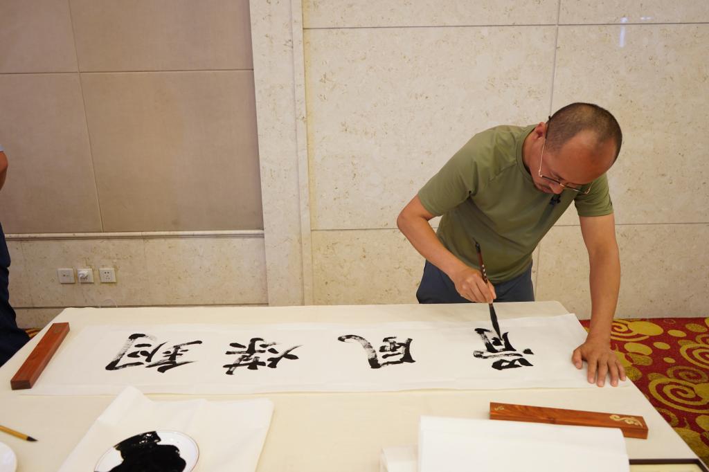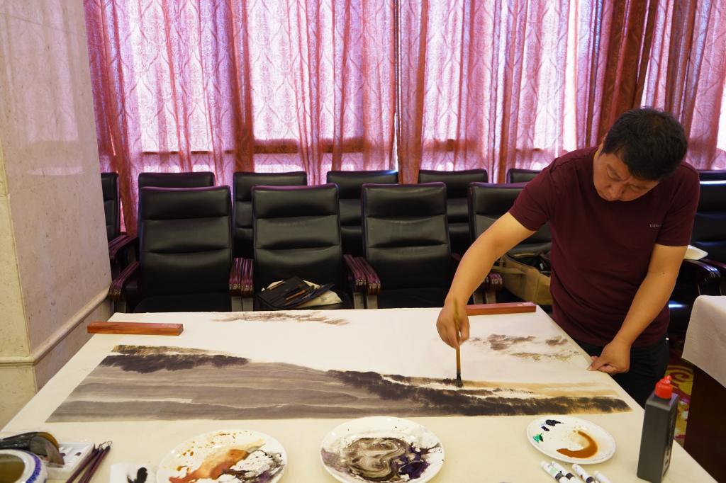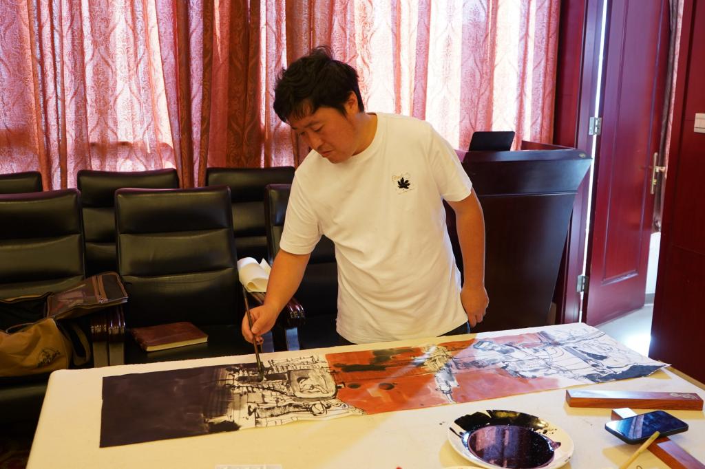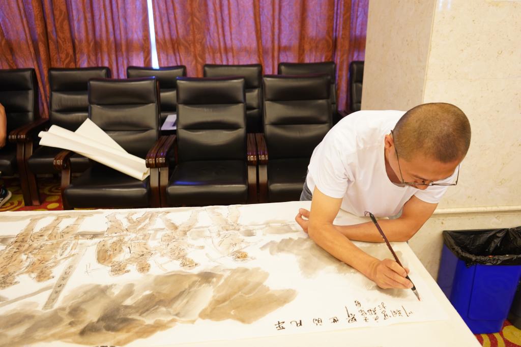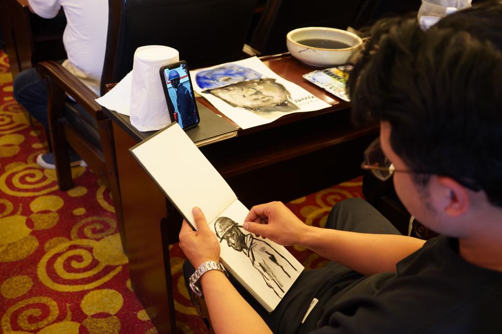 實地采風結束后,藝術家們結合采風的見聞感受和迸發(fā)的創(chuàng)作靈感,現(xiàn)場揮毫潑墨,以書法、國畫、素描、木版刻畫、水墨畫等多種藝術形式,通過創(chuàng)作精品佳作,對煤礦工人辛勤勞動的工作場景、昂揚奮斗的精神面貌和銅川礦區(qū)改革發(fā)展取得的成果進行了深情描繪、藝術呈現(xiàn)和謳歌禮贊。