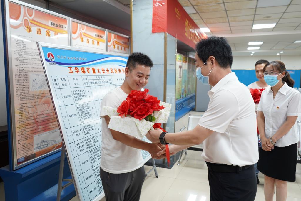 現(xiàn)場觀摩期間,與會人員還一起參與了該礦正在井口候車大廳開展的為七一當(dāng)天過生日的職工“送生日祝福 囑安全生產(chǎn)”親情服務(wù)活動。在活動現(xiàn)場,公司黨委書記、董事長劉水利與3名過生日的職工進(jìn)行了親切交談,他說“你們的生日與黨的生日是同一天,這很有紀(jì)念意義,你們是礦區(qū)的建設(shè)者,在此向大家送上生日的祝福,希望你們牢記職責(zé)、肩負(fù)使命、安全生產(chǎn),為企業(yè)發(fā)展做出新的更大的貢獻(xiàn)?!痹诒娙她R唱生日快樂的歌聲中,劉水利為過生日的職工送上了鮮花、賀卡和生日祝福,讓職工們備受感動、鼓舞和激勵。