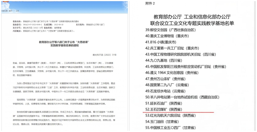 為深入貫徹習(xí)近平總書記關(guān)于“大思政課”的重要指示批示精神,加快構(gòu)建“大思政課”工作格局,推進(jìn)習(xí)近平新時(shí)代中國(guó)特色社會(huì)主義思想“三進(jìn)”工作,教育部與科學(xué)技術(shù)部、工業(yè)和信息化部、生態(tài)環(huán)境部、國(guó)家衛(wèi)生健康委、國(guó)家文物局、國(guó)家鄉(xiāng)村振興局、中國(guó)關(guān)心下一代工作委員會(huì)聯(lián)合設(shè)立“大思政課”實(shí)踐教學(xué)基地,并于近日公布首批453家“大思政課”實(shí)踐教學(xué)基地名單。在這些基地中,全國(guó)煤炭行業(yè)共有6家涉煤?jiǎn)挝粯s獲工業(yè)文化專題實(shí)踐教學(xué)基地,公司王石凹煤礦名列其中。