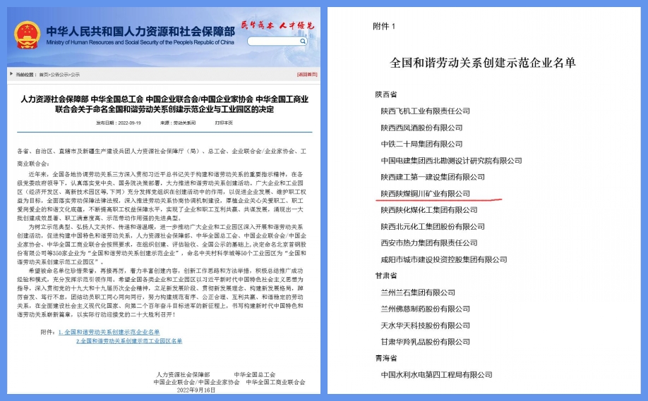 為樹立示范典型、弘揚(yáng)人文關(guān)懷、傳遞和諧溫暖,進(jìn)一步推動(dòng)廣大企業(yè)和工業(yè)園區(qū)深入開展和諧勞動(dòng)關(guān)系創(chuàng)建活動(dòng),促進(jìn)構(gòu)建中國(guó)特色和諧勞動(dòng)關(guān)系,近日,人力資源社會(huì)保障部、中華全國(guó)總工會(huì)、中國(guó)企業(yè)聯(lián)合會(huì)/中國(guó)企業(yè)家協(xié)會(huì)、中華全國(guó)工商業(yè)聯(lián)合會(huì)共同發(fā)布了關(guān)于命名全國(guó)和諧勞動(dòng)關(guān)系創(chuàng)建示范企業(yè)與工業(yè)園區(qū)的決定,其中公司榮列“全國(guó)和諧勞動(dòng)關(guān)系創(chuàng)建示范企業(yè)”單位榜單,既是銅川市唯一上榜企業(yè),也是陜西企業(yè)中唯一上榜的煤炭企業(yè)。